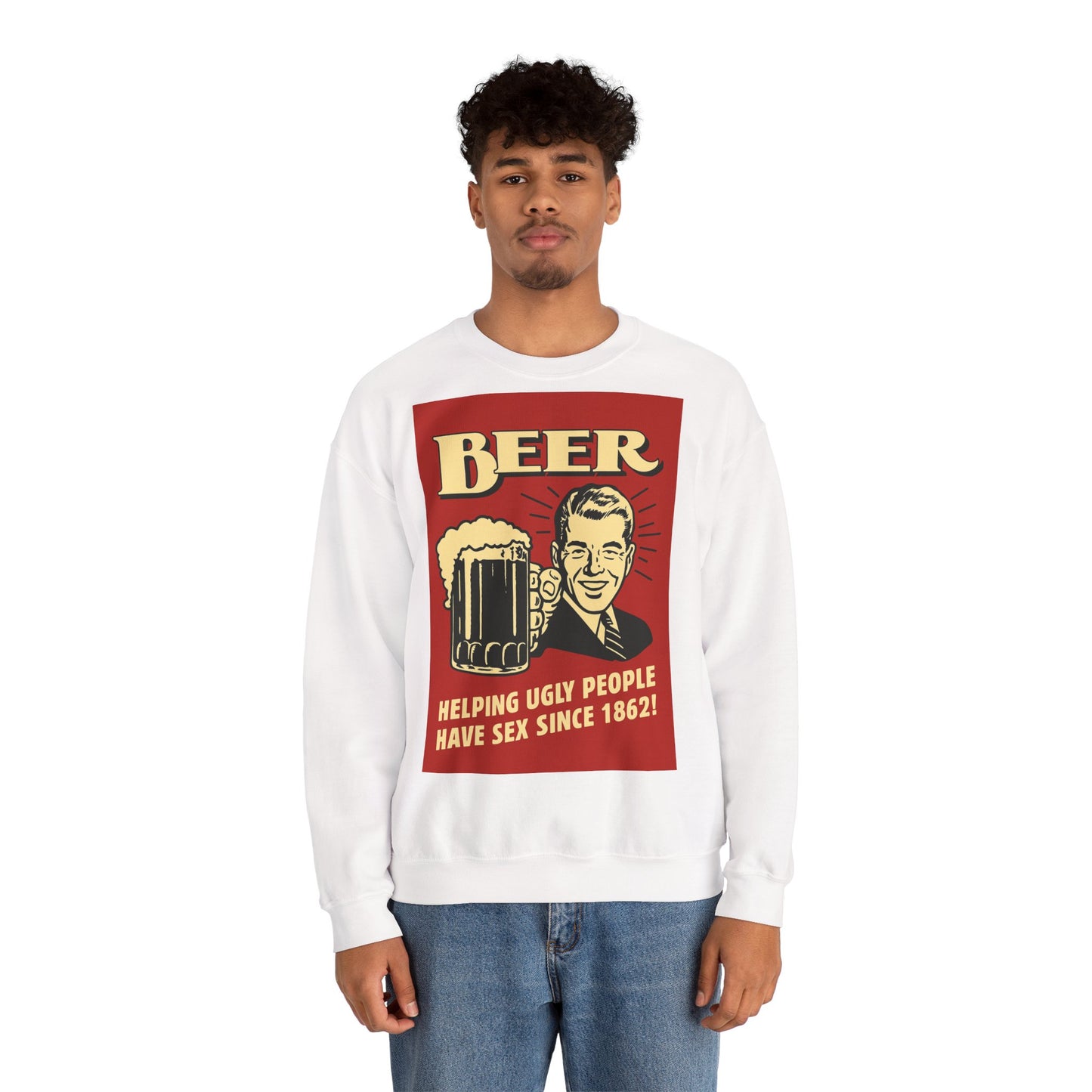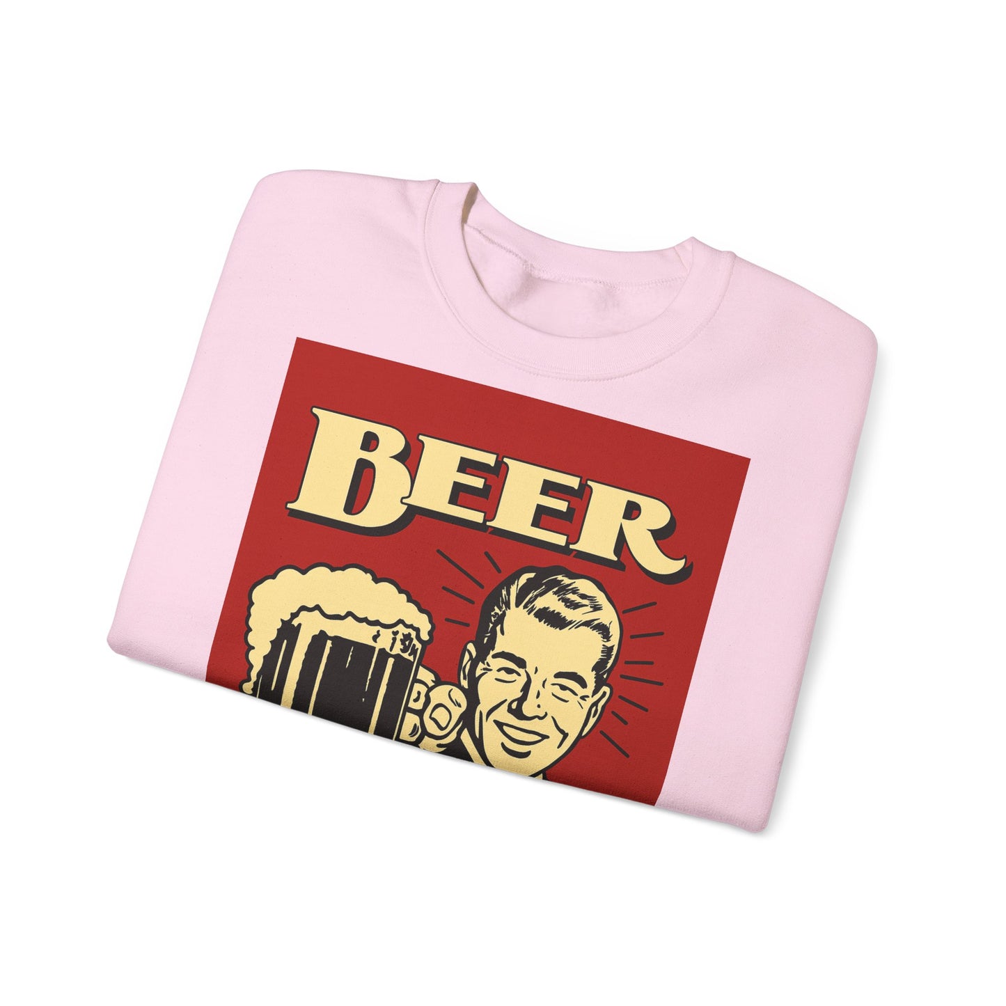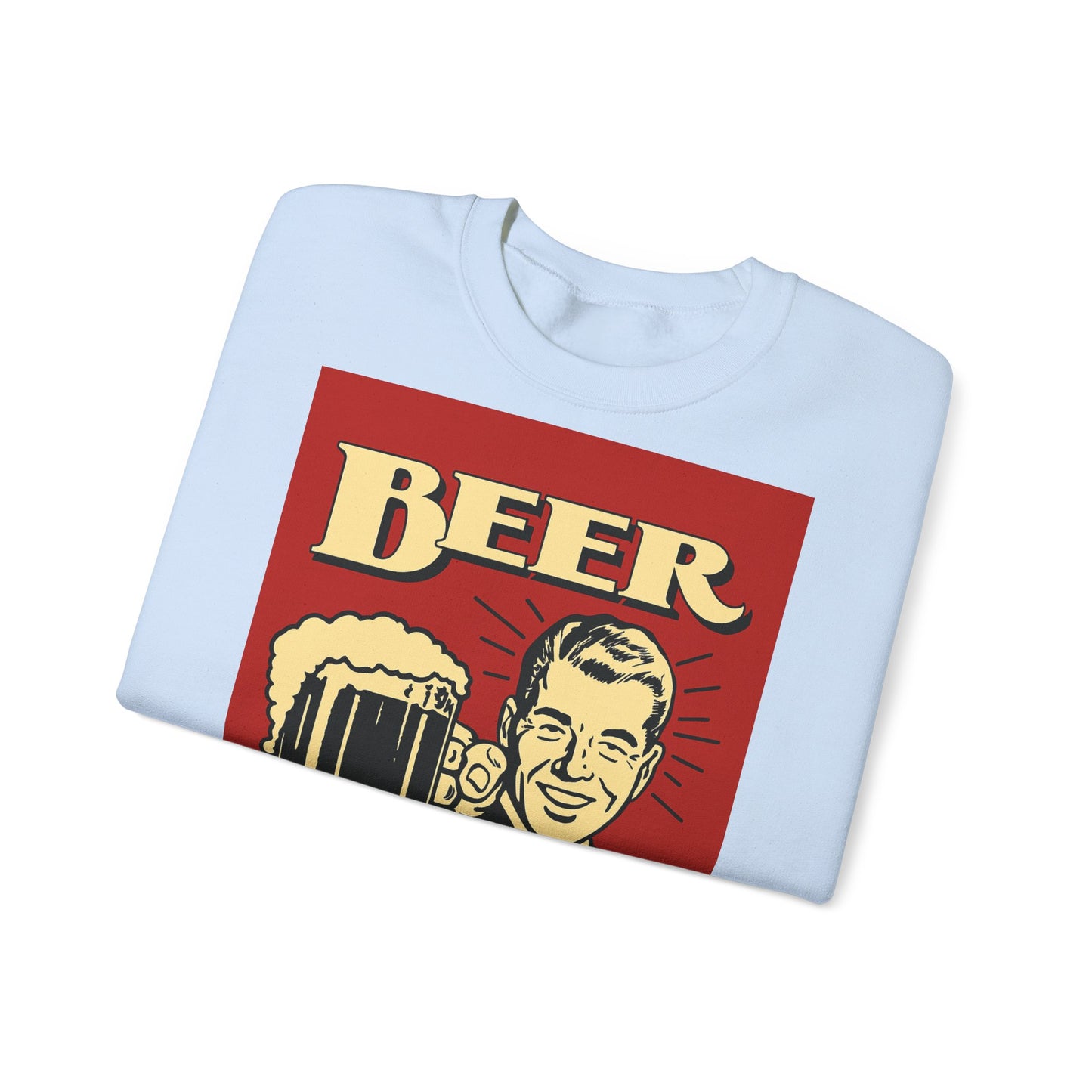 What warms you up better than beer? A sweatshirt that reminds you of its social impact. This retro motif boasts a 50s advertising aesthetic and a slogan that hits below the belt—and straight to the heart.