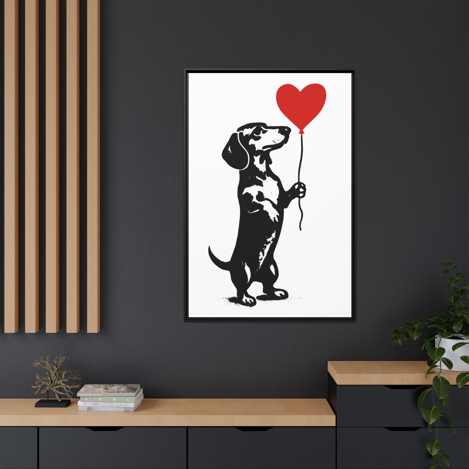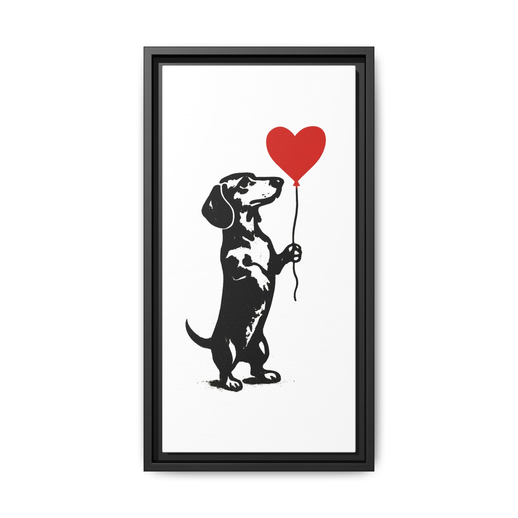 Dieses Canvas-Motiv zeigt einen Dackel, aufrecht stehend, mit einem Herzballon in der Pfote. Schwarz-weiß, reduziert, fast fragil – und genau deshalb so wirkungsvoll.