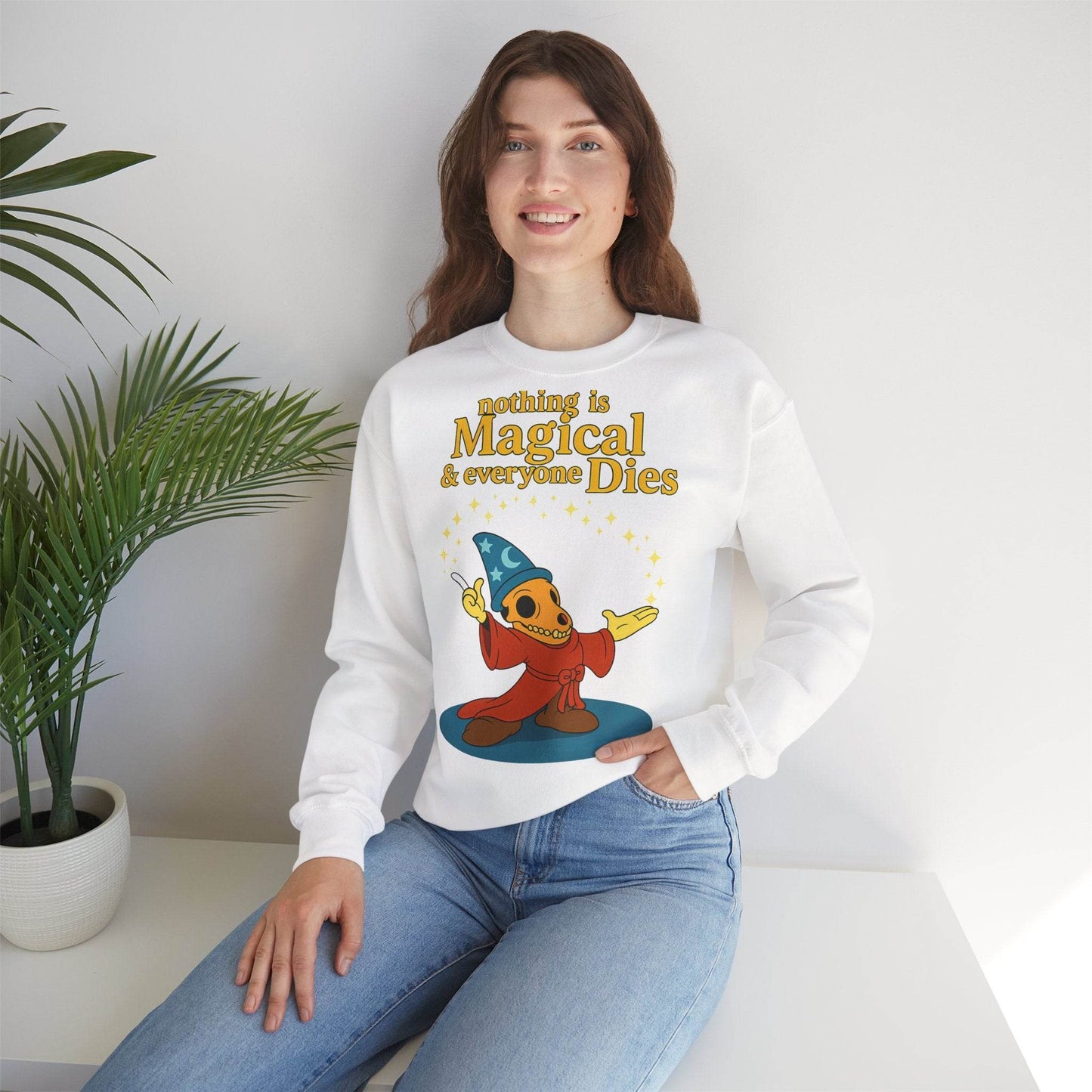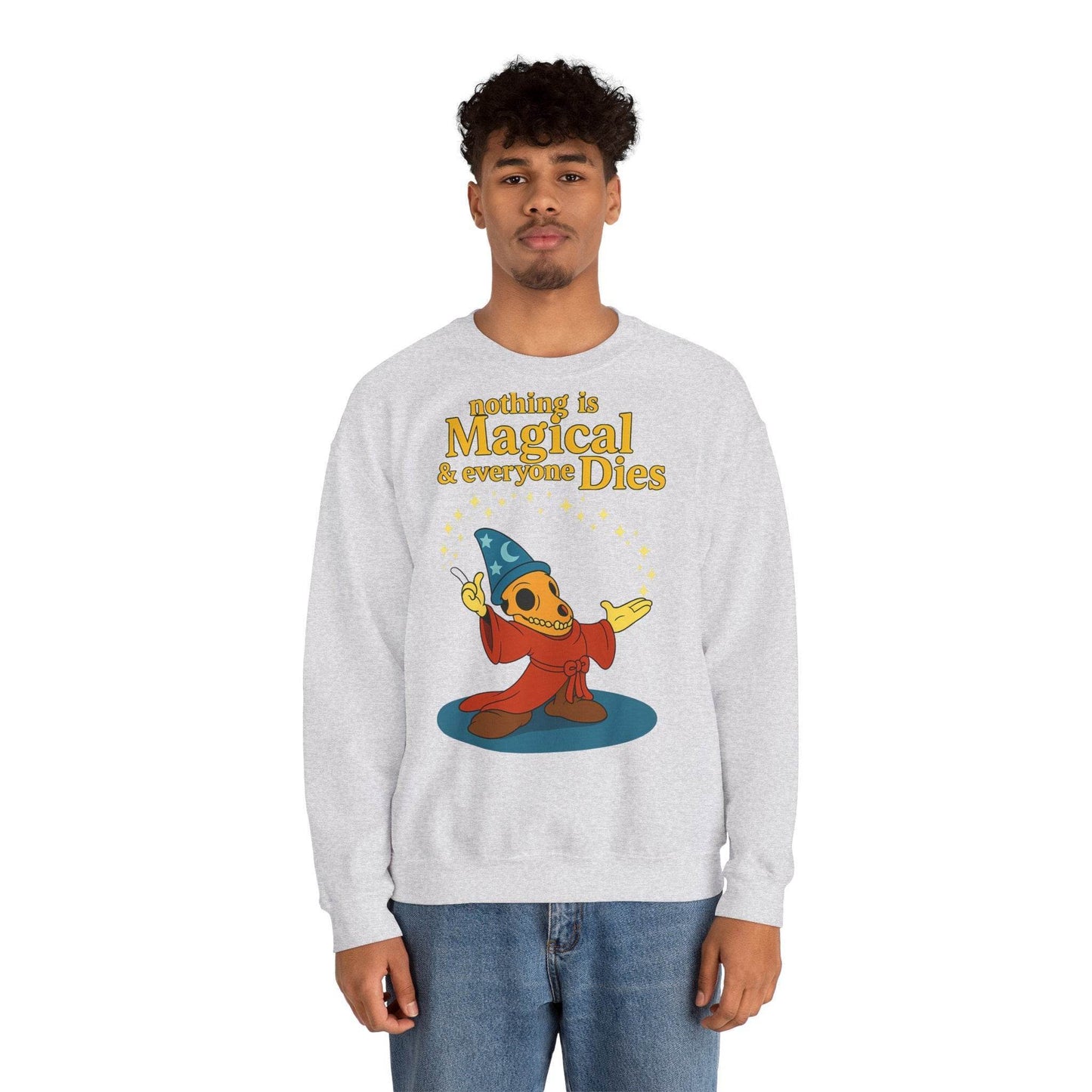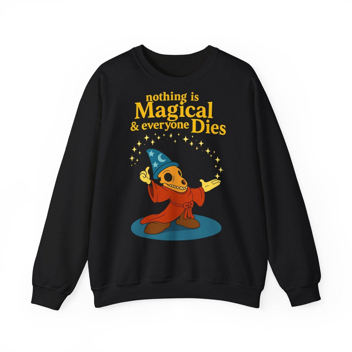 Make yourself comfortable – but without illusions. This sweatshirt features the sarcastic cult motif "Nothing is Magical & everyone Dies," combining dark humor with warm comfort. The print features a charmingly cynical skeleton in a magical robe, who, with a wave of his finger, dispels all the illusions usually printed on sweaters.