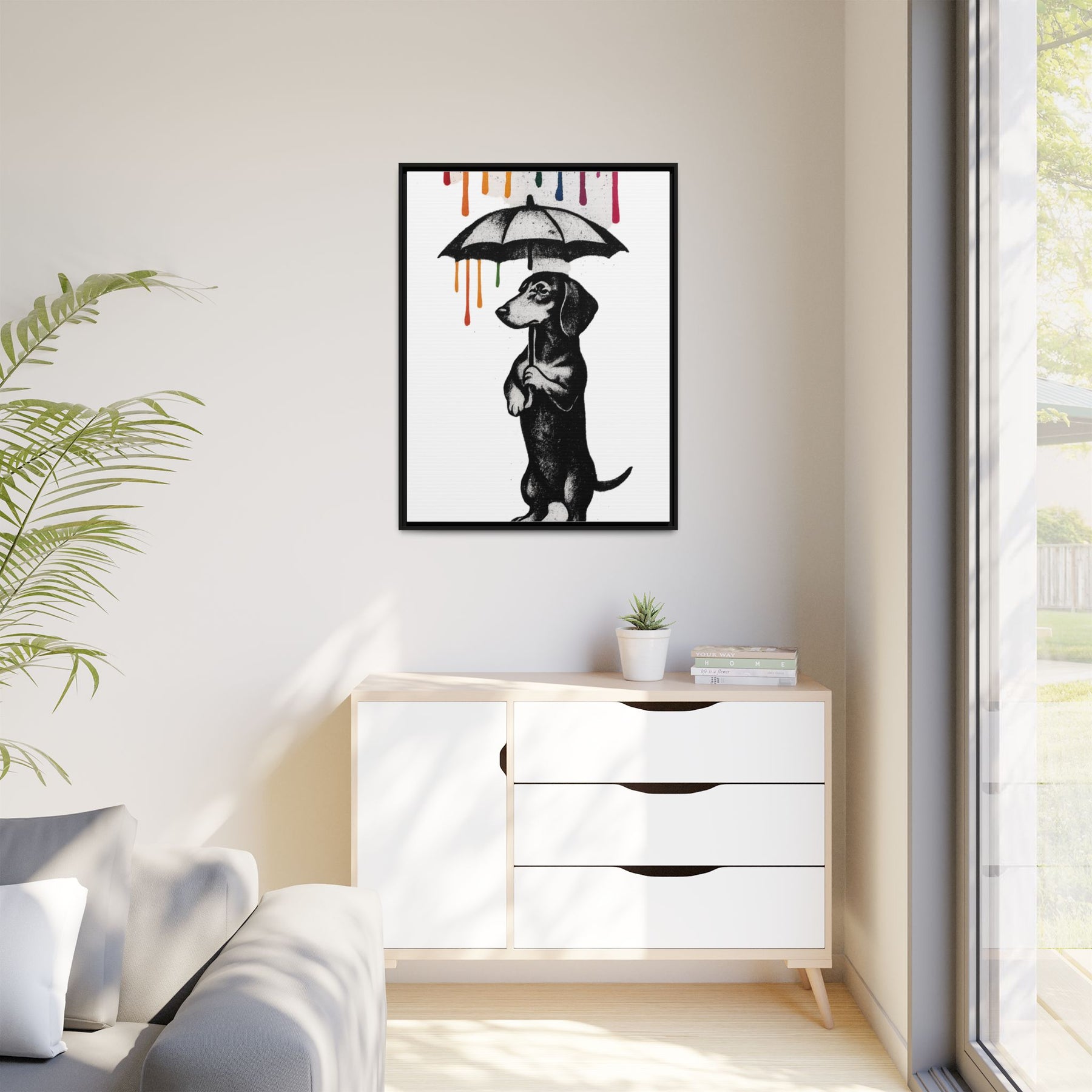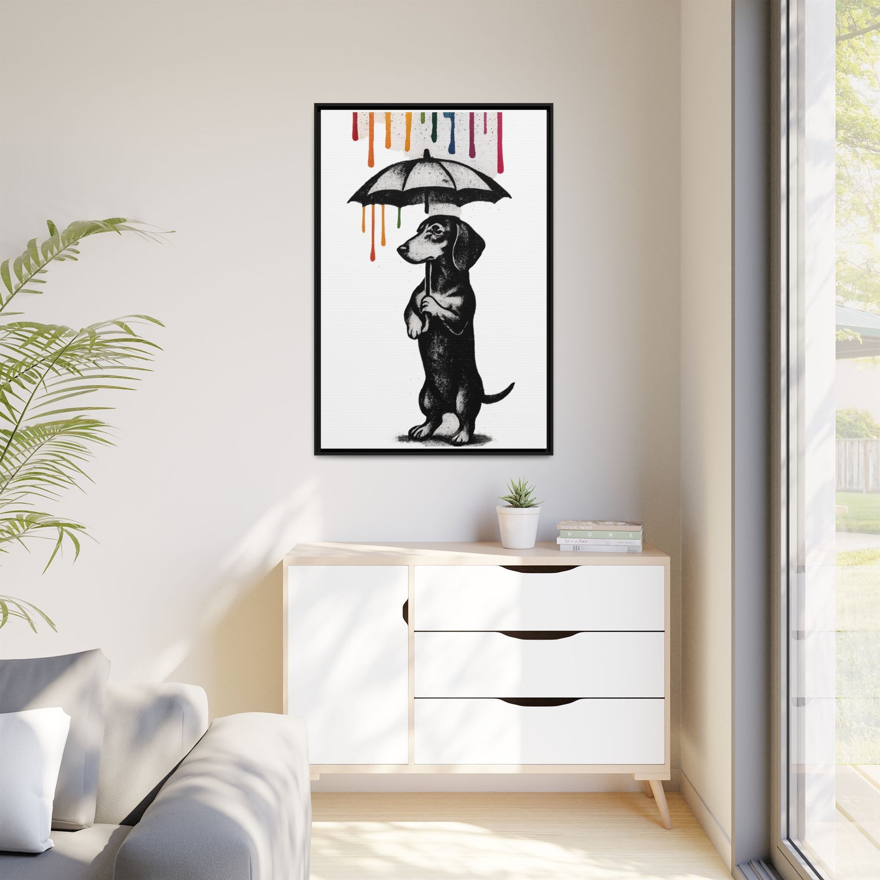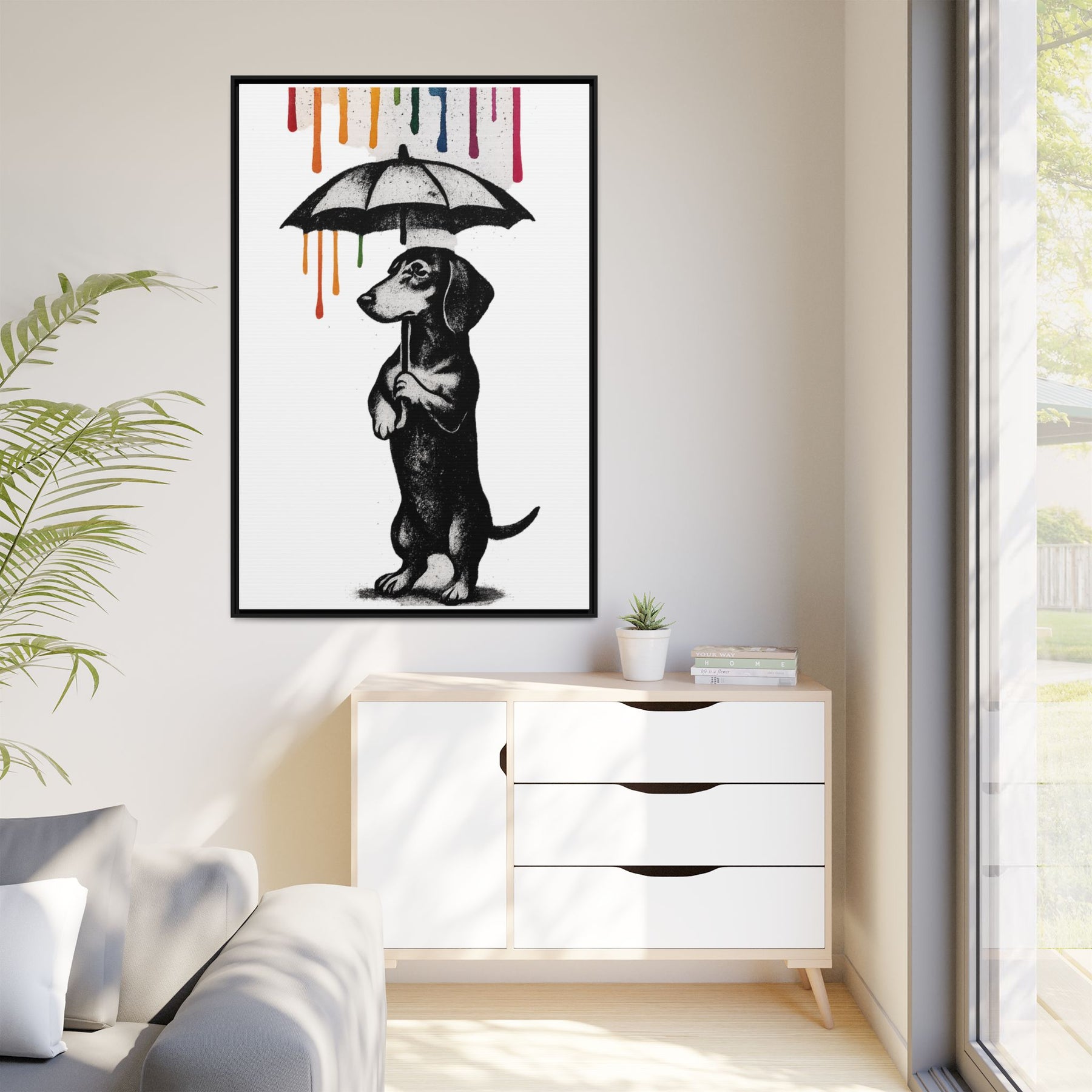 Ob im Wohnzimmer, Homeoffice, Flur oder im Büro: Dieses Motiv ist Blickfang, Gesprächsanlass und stiller Kommentar zugleich. Es passt zu Menschen, die ihren Humor trocken, ihre Kunst klar und ihre Räume charakterstark mögen. Perfekt auch als Geschenk für Dackel-Fans, Hundemenschen oder alle, die gerade „ein bisschen Farbe über dem Kopf“ vertragen können.