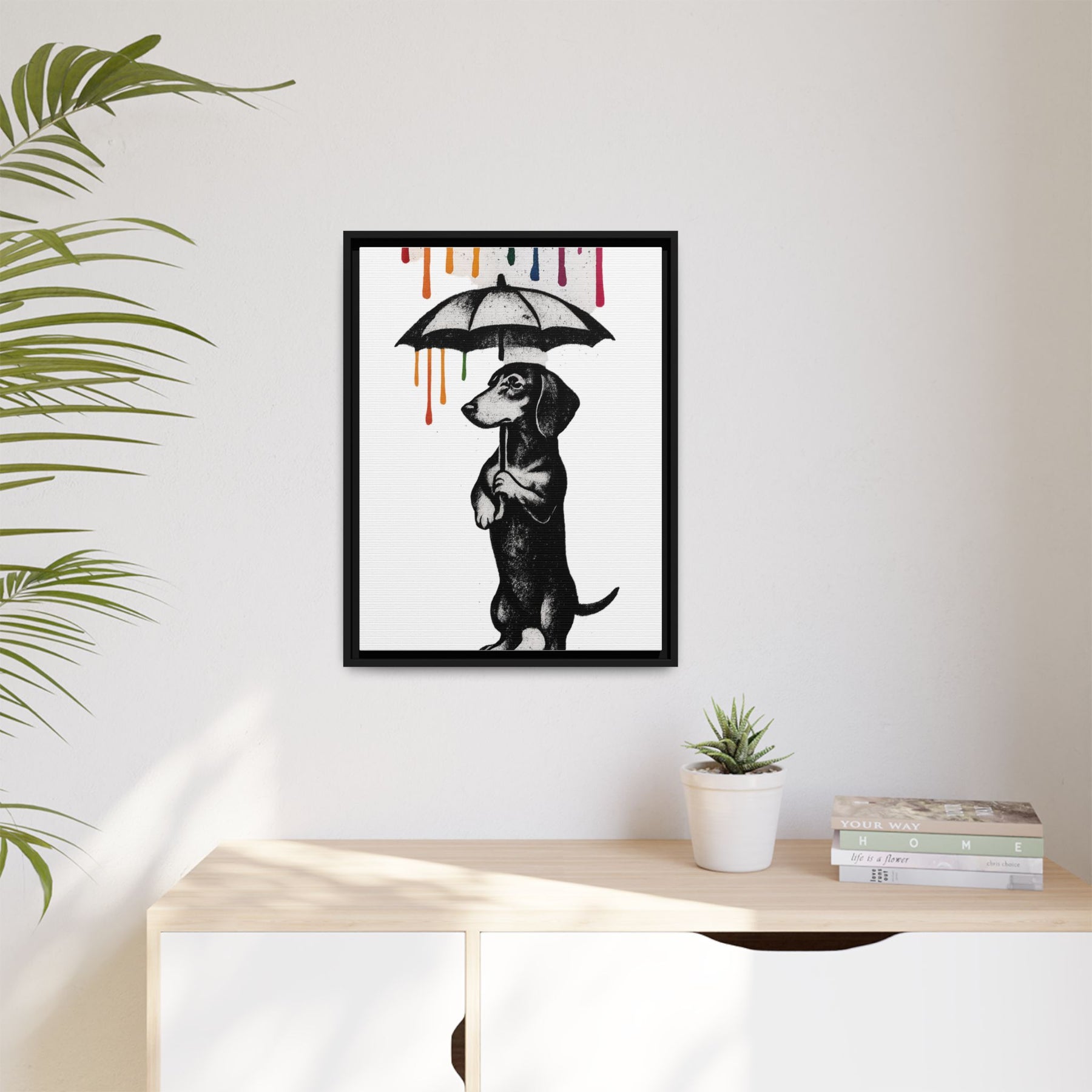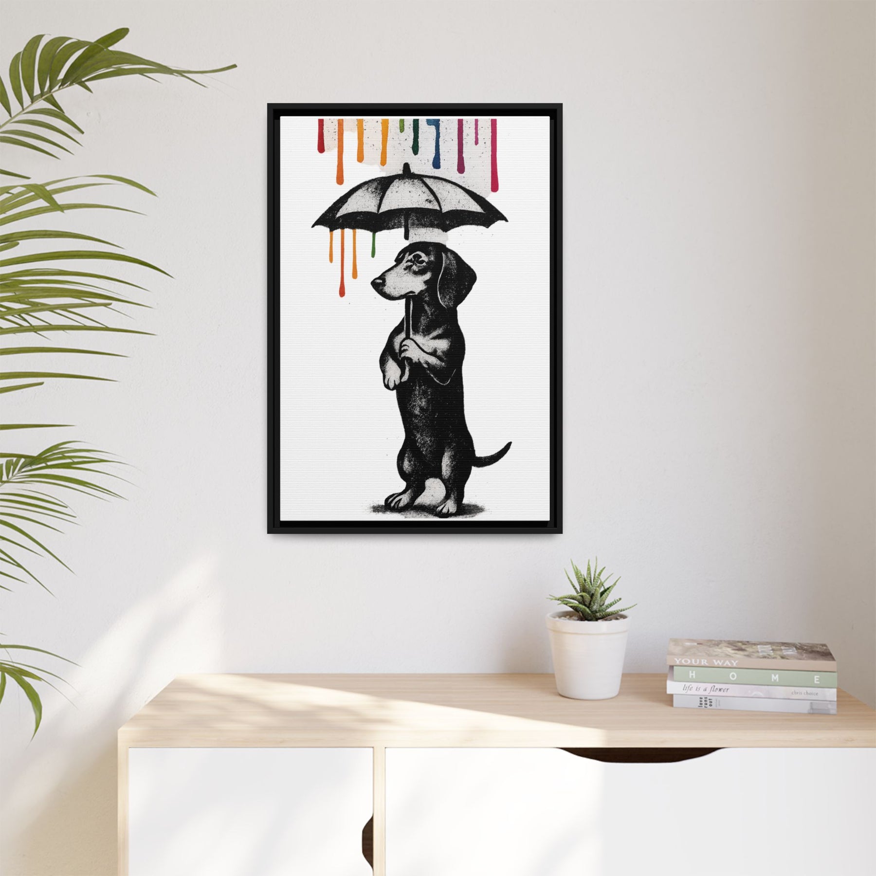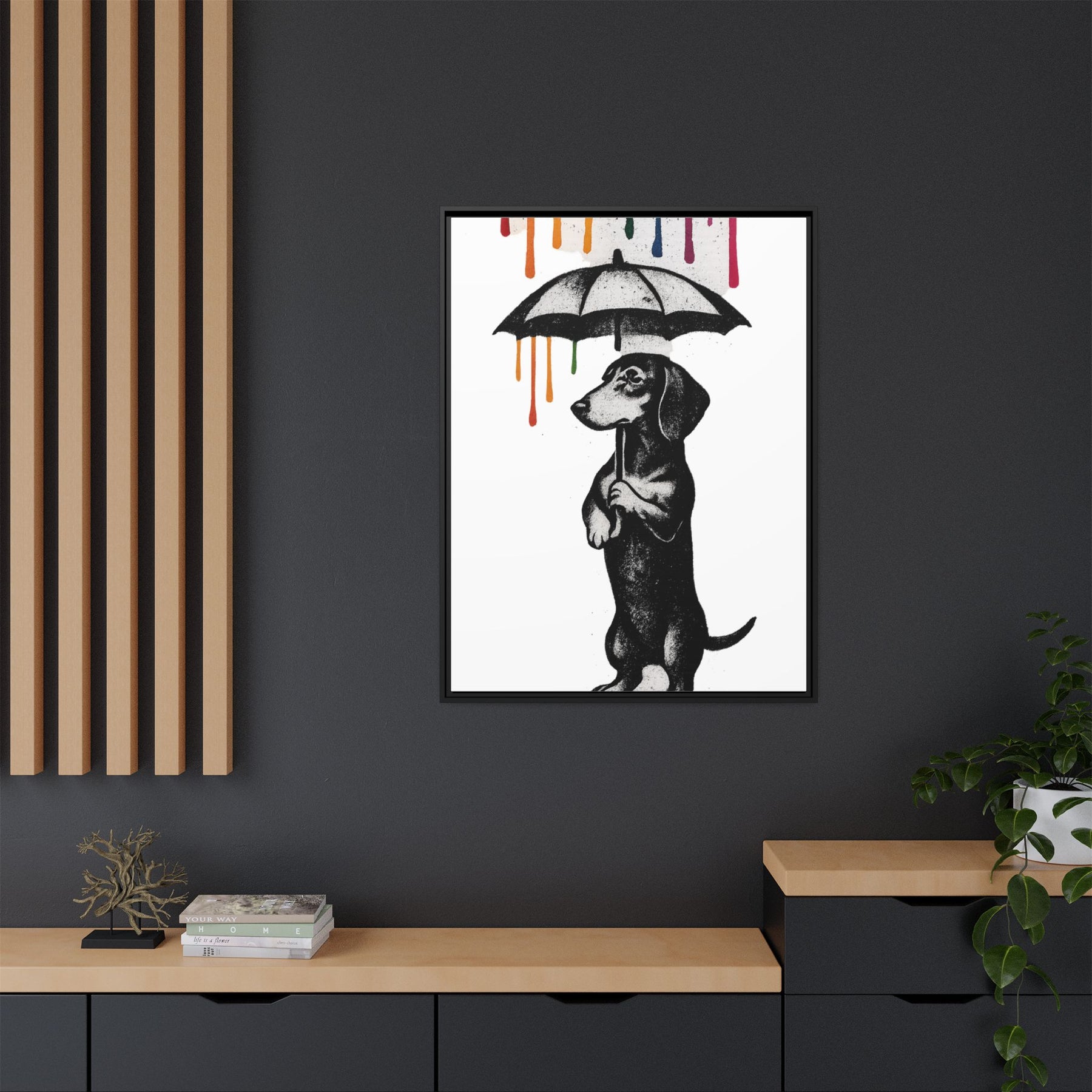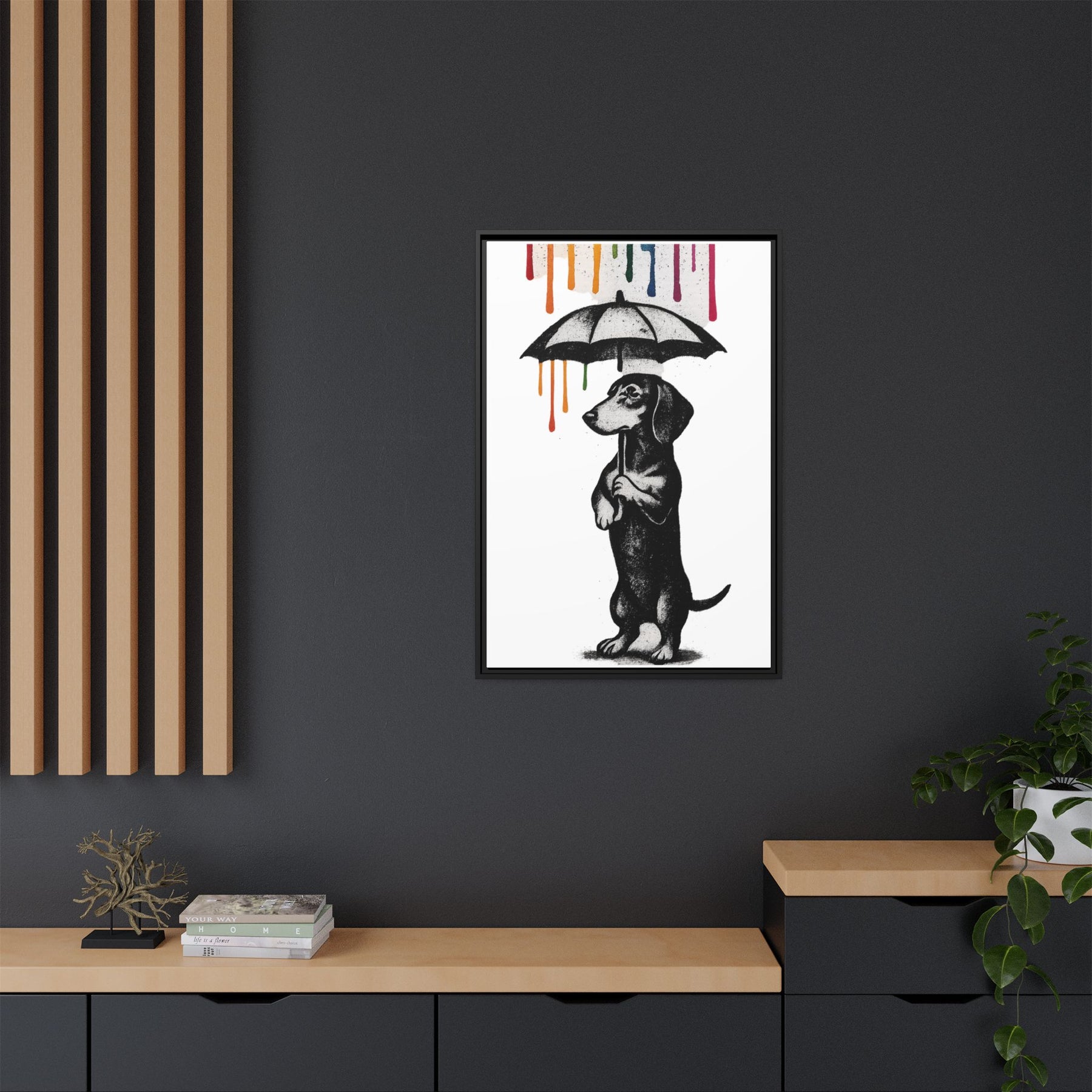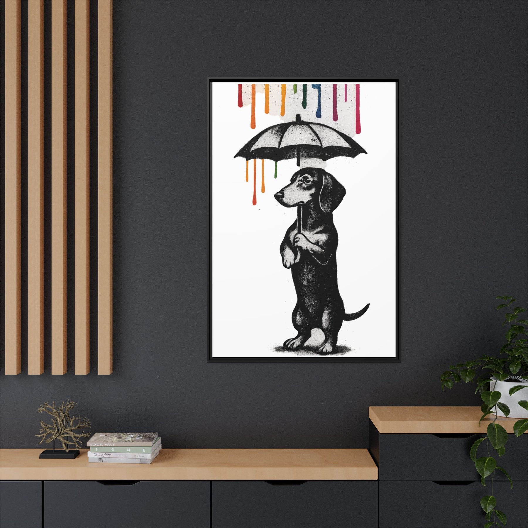 ieses Canvas zeigt einen Dackel, der mehr Lebensphilosophie in sich trägt als so manche Selbsthilfe-Bibel. Aufrecht stehend, Pfoten am Griff des Regenschirms, blickt er nach vorne – während von oben leuchtende Farbtropfen in Gelb, Orange, Grün, Blau und Pink herabrinnen.