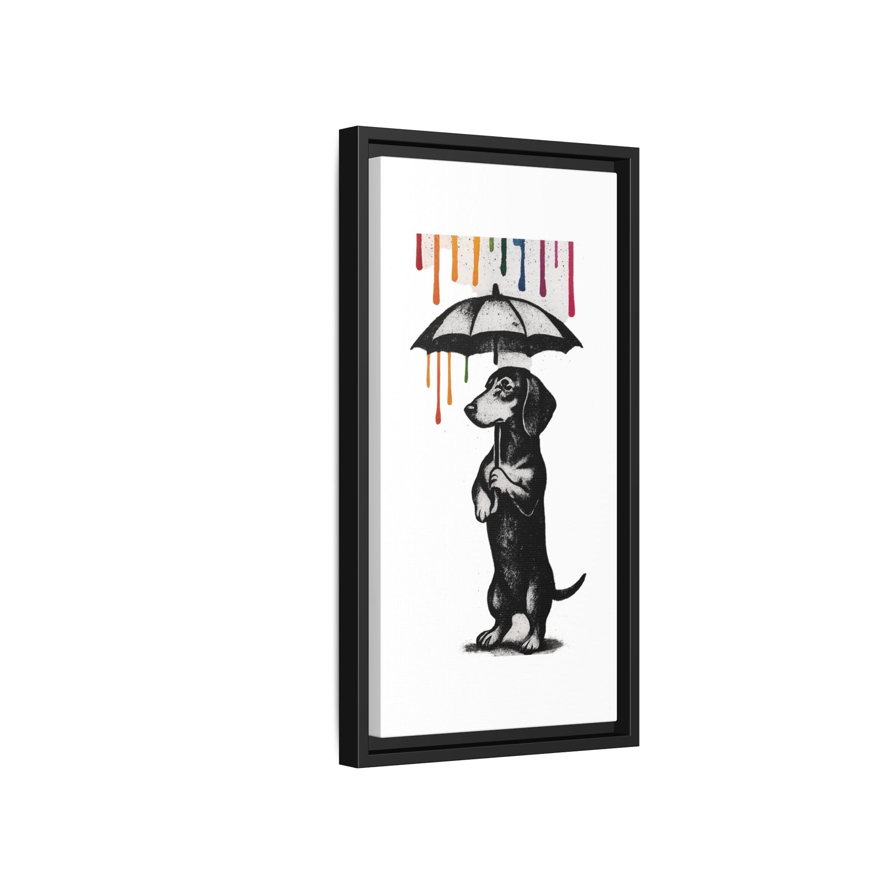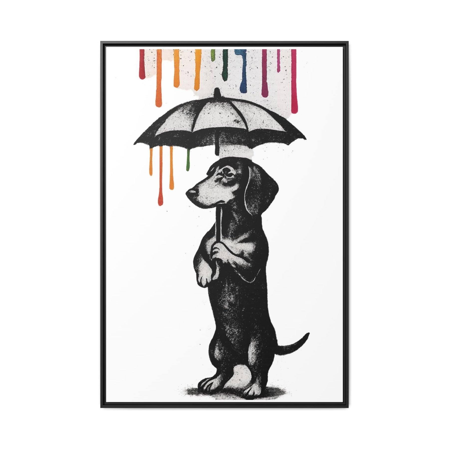 Dackel im Farbenregen – Street-Art Canvas mit Regenschirm & Farbtropfen