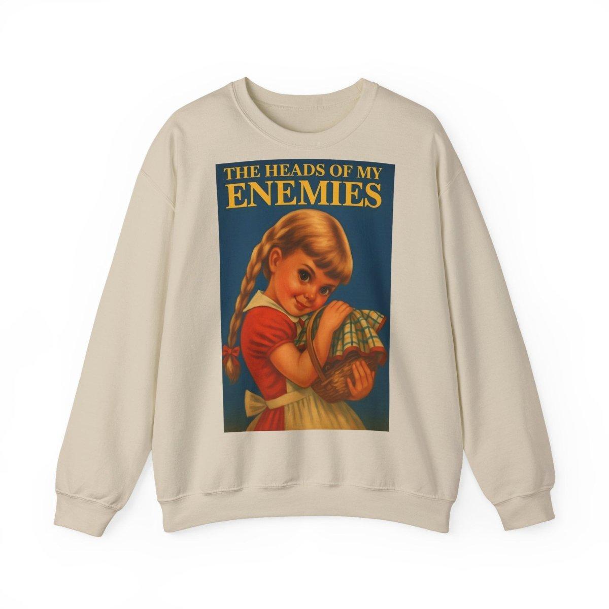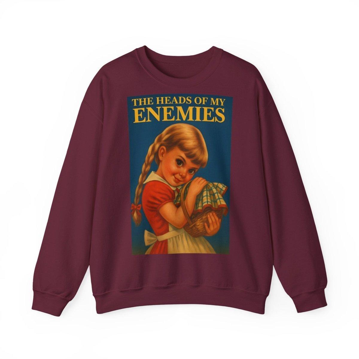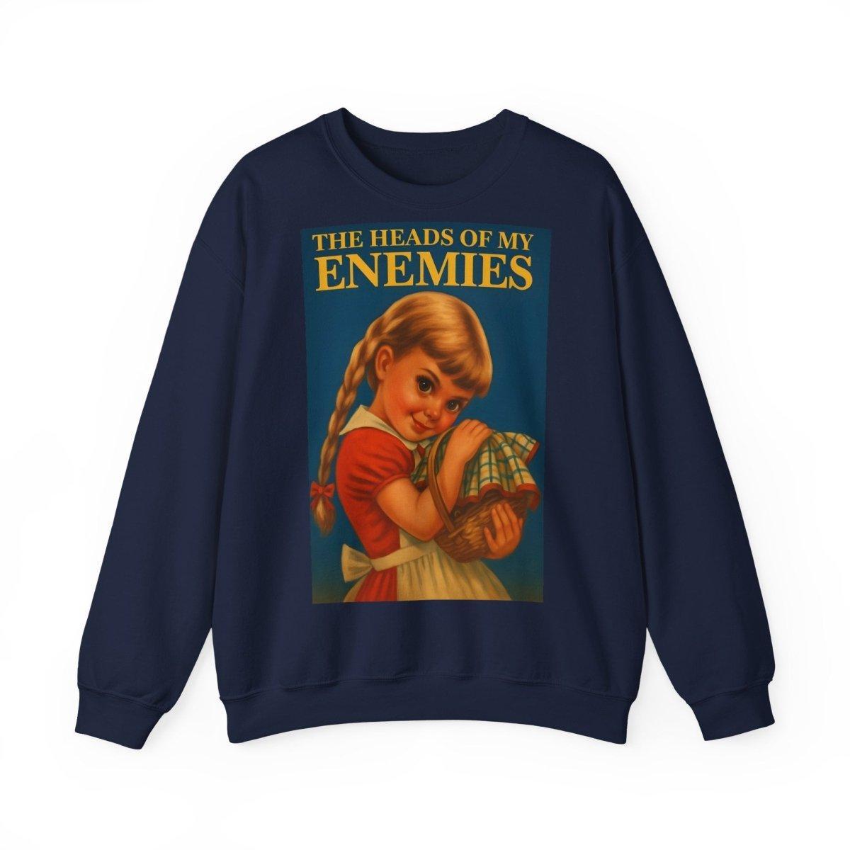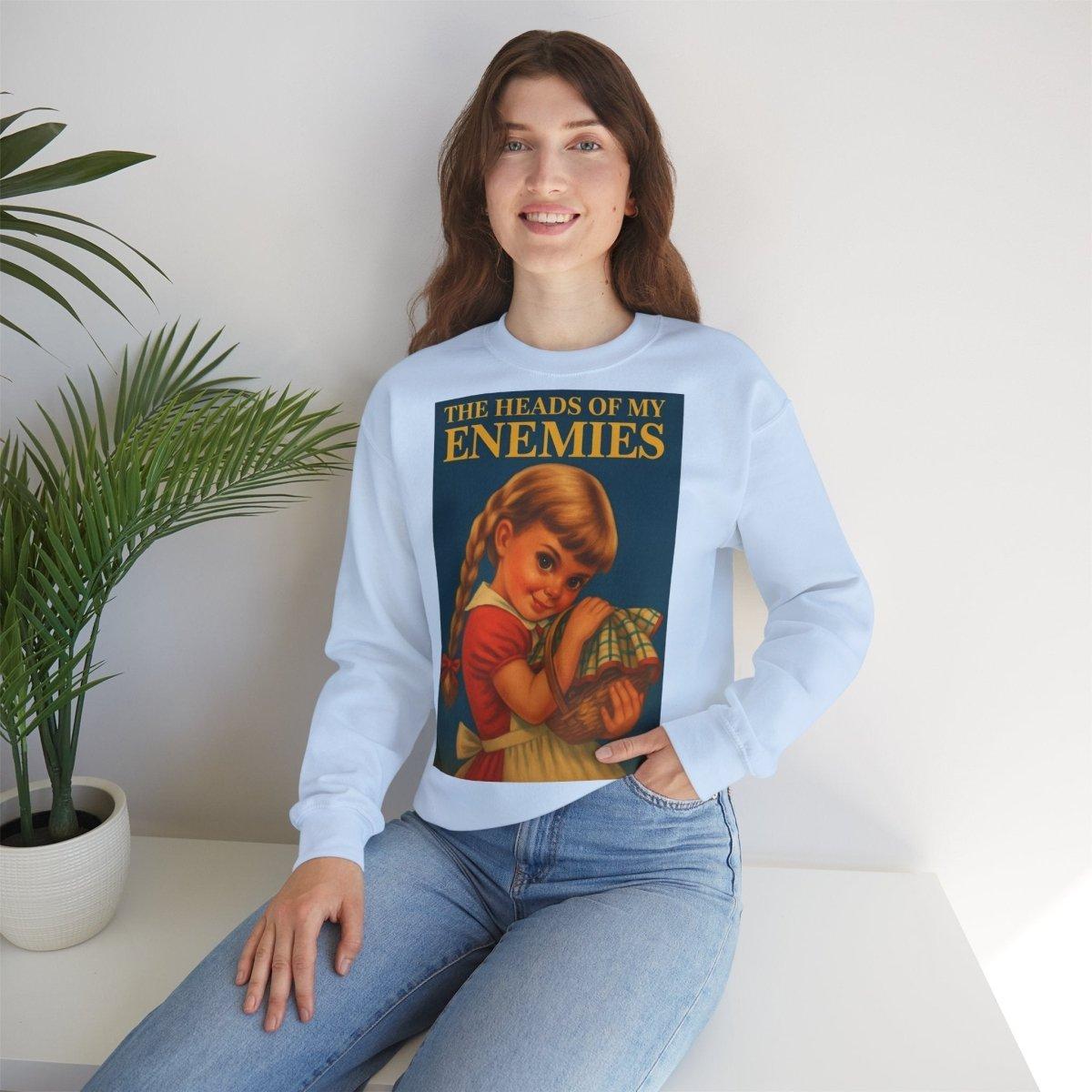 Warm, soft—and razor-sharp: This sweatshirt is for anyone who can't choose between a childhood aesthetic and deep, dark sarcasm. The retro motif featuring a girl and the text "The Heads of My Enemies" brings an unexpected punchline to the fabric. Ideal for people who value subtext and style equally.