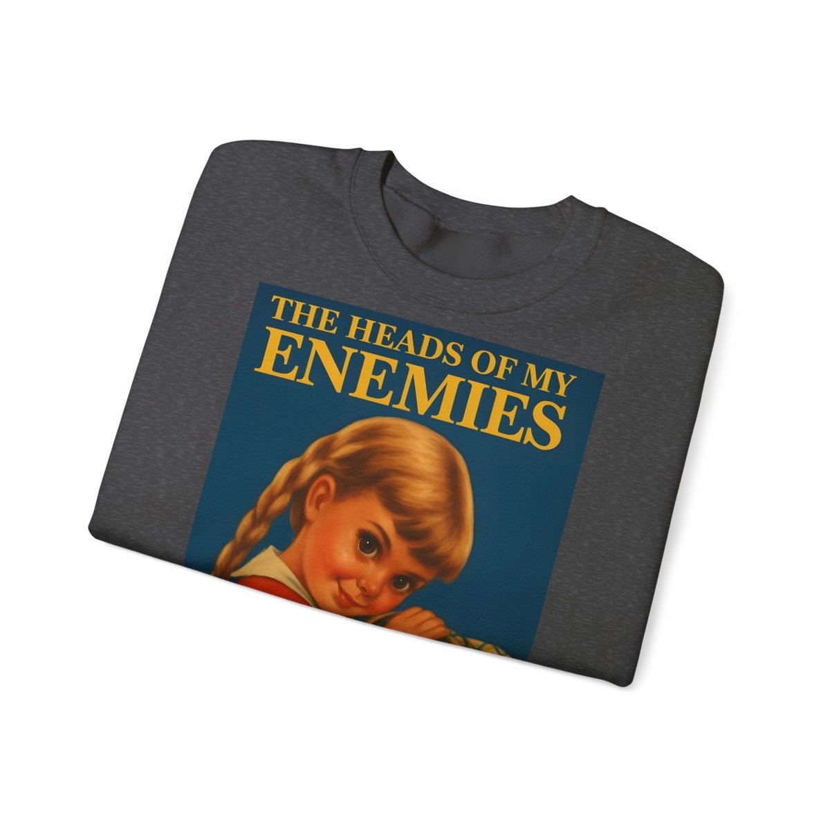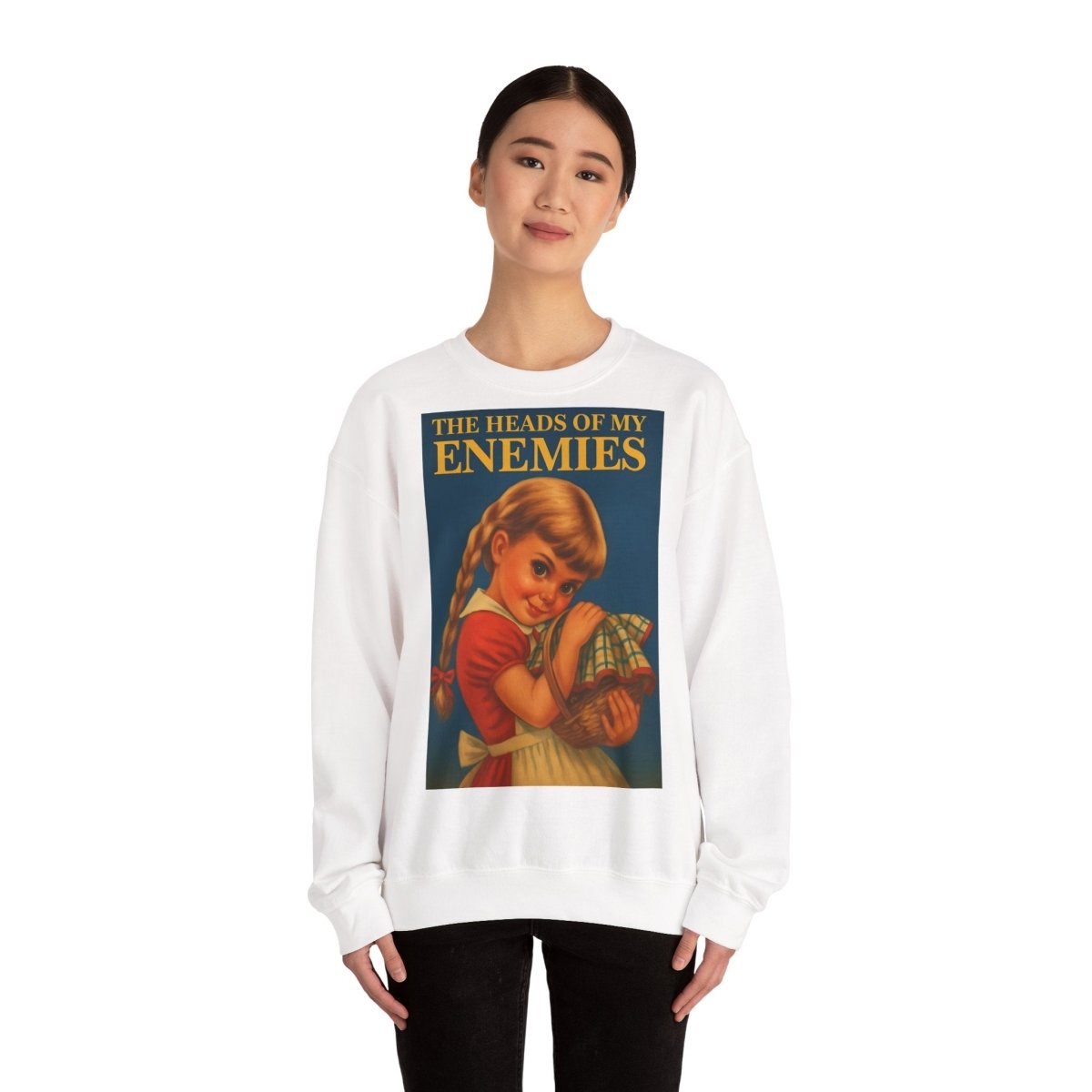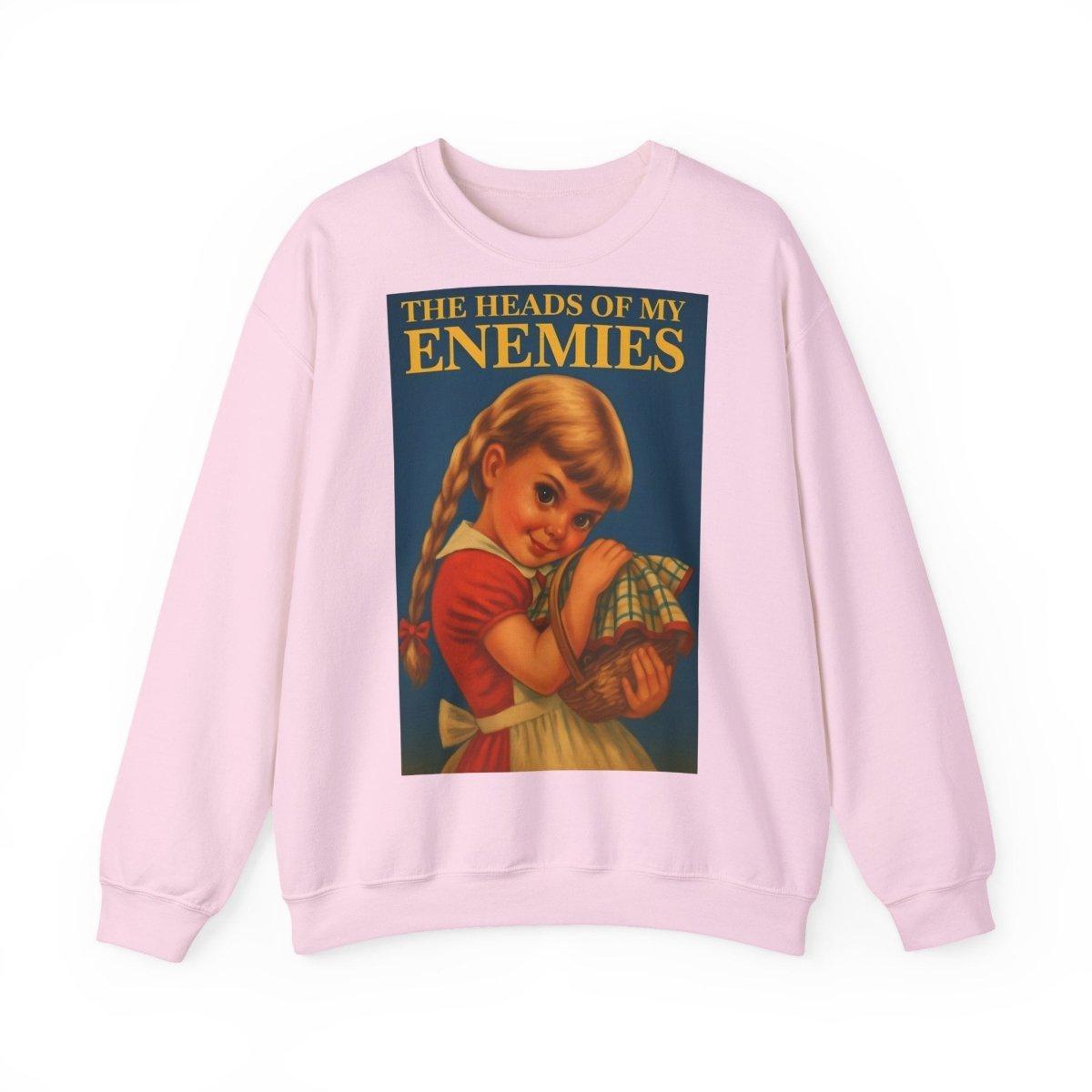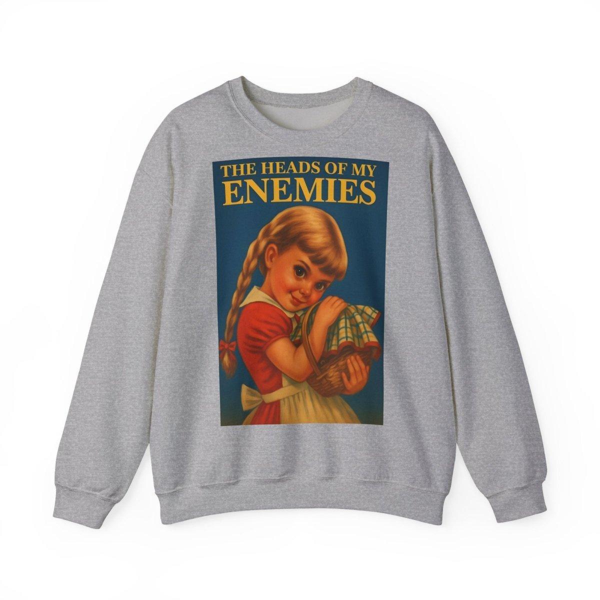 Warm, soft—and razor-sharp: This sweatshirt is for anyone who can't choose between a childhood aesthetic and deep, dark sarcasm. The retro motif featuring a girl and the text "The Heads of My Enemies" brings an unexpected punchline to the fabric. Ideal for people who value subtext and style equally.