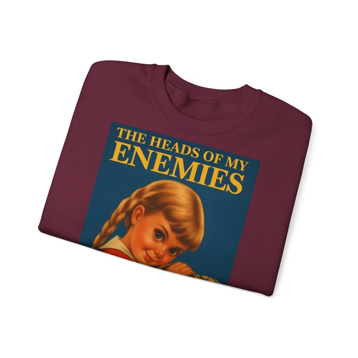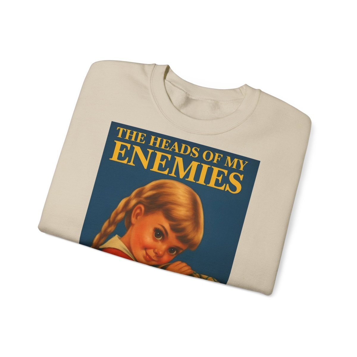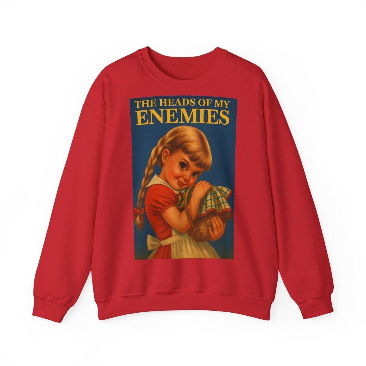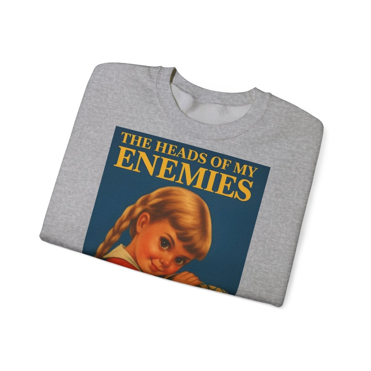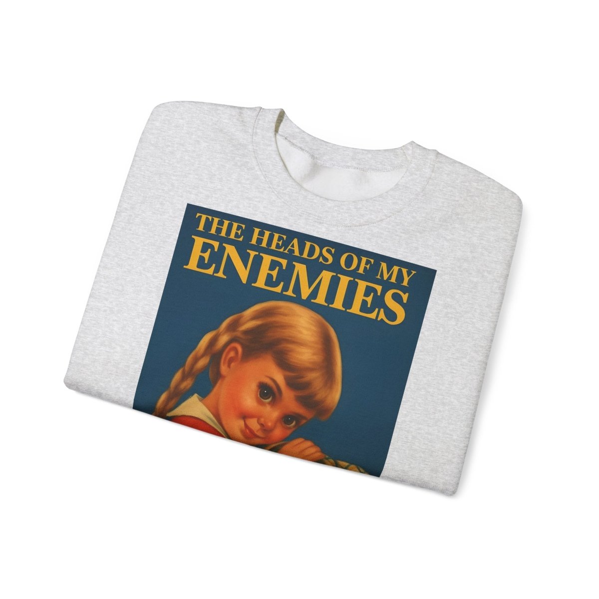 Warm, soft—and razor-sharp: This sweatshirt is for anyone who can't choose between a childhood aesthetic and deep, dark sarcasm. The retro motif featuring a girl and the text "The Heads of My Enemies" brings an unexpected punchline to the fabric. Ideal for people who value subtext and style equally.
