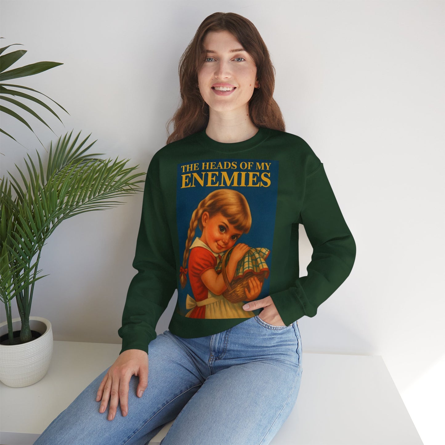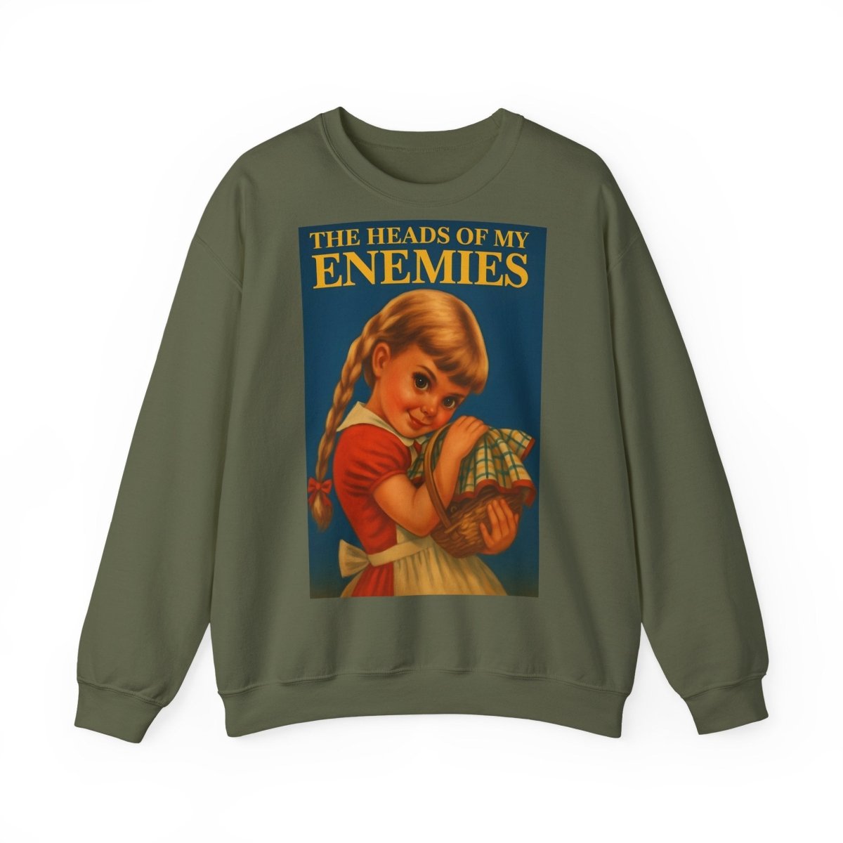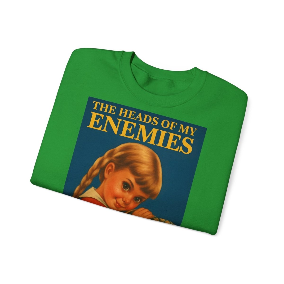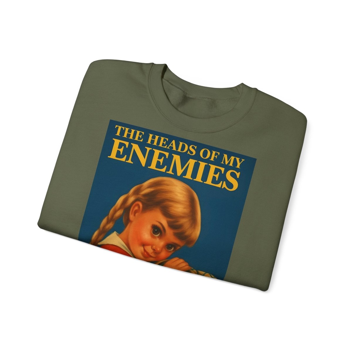 Warm, soft—and razor-sharp: This sweatshirt is for anyone who can't choose between a childhood aesthetic and deep, dark sarcasm. The retro motif featuring a girl and the text "The Heads of My Enemies" brings an unexpected punchline to the fabric. Ideal for people who value subtext and style equally.