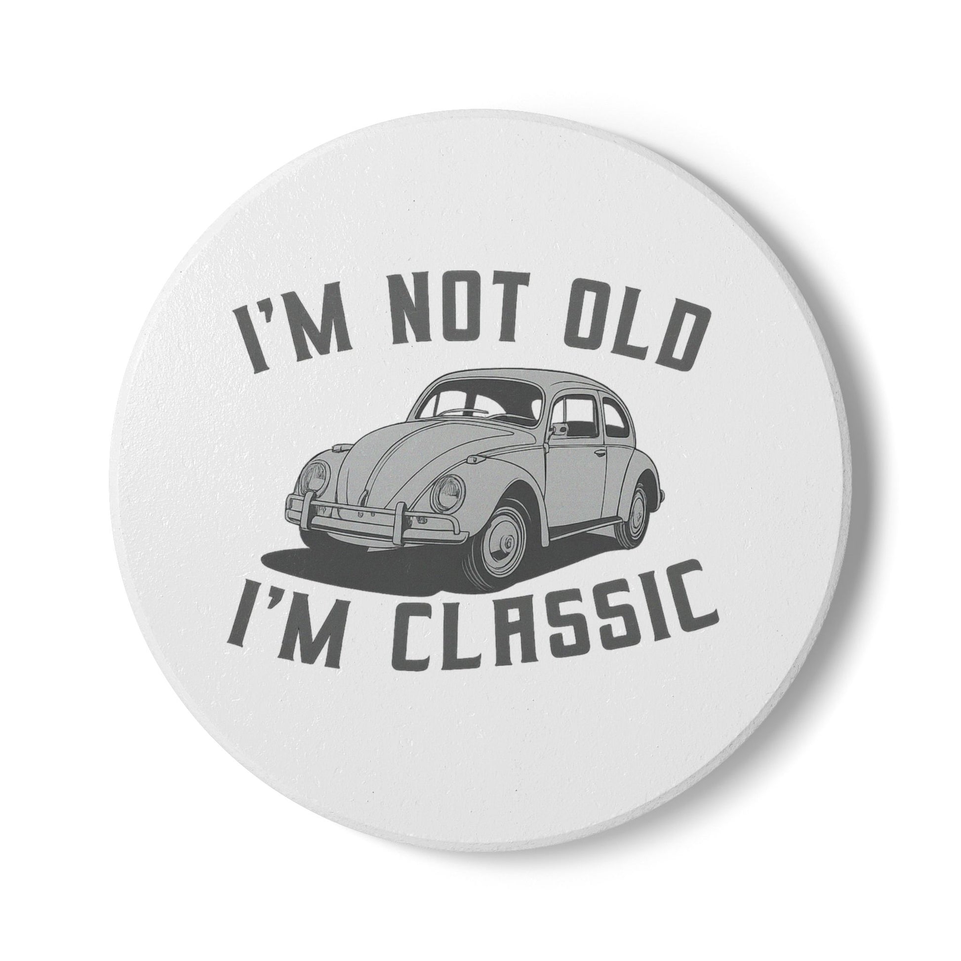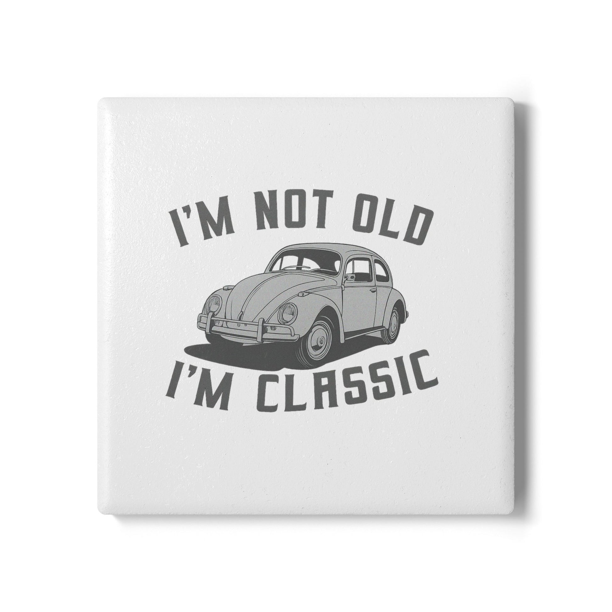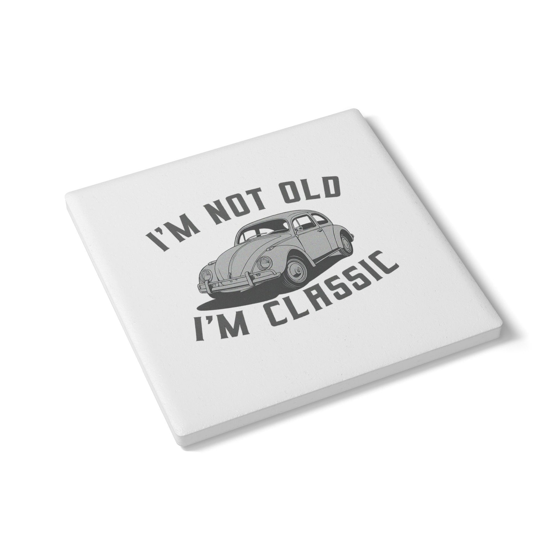 VW Käfer Untersetzer – „I’m Not Old, I’m Classic“ – Lustiger Keramik Coaster mit Kult-Käfer & Korkrückseite