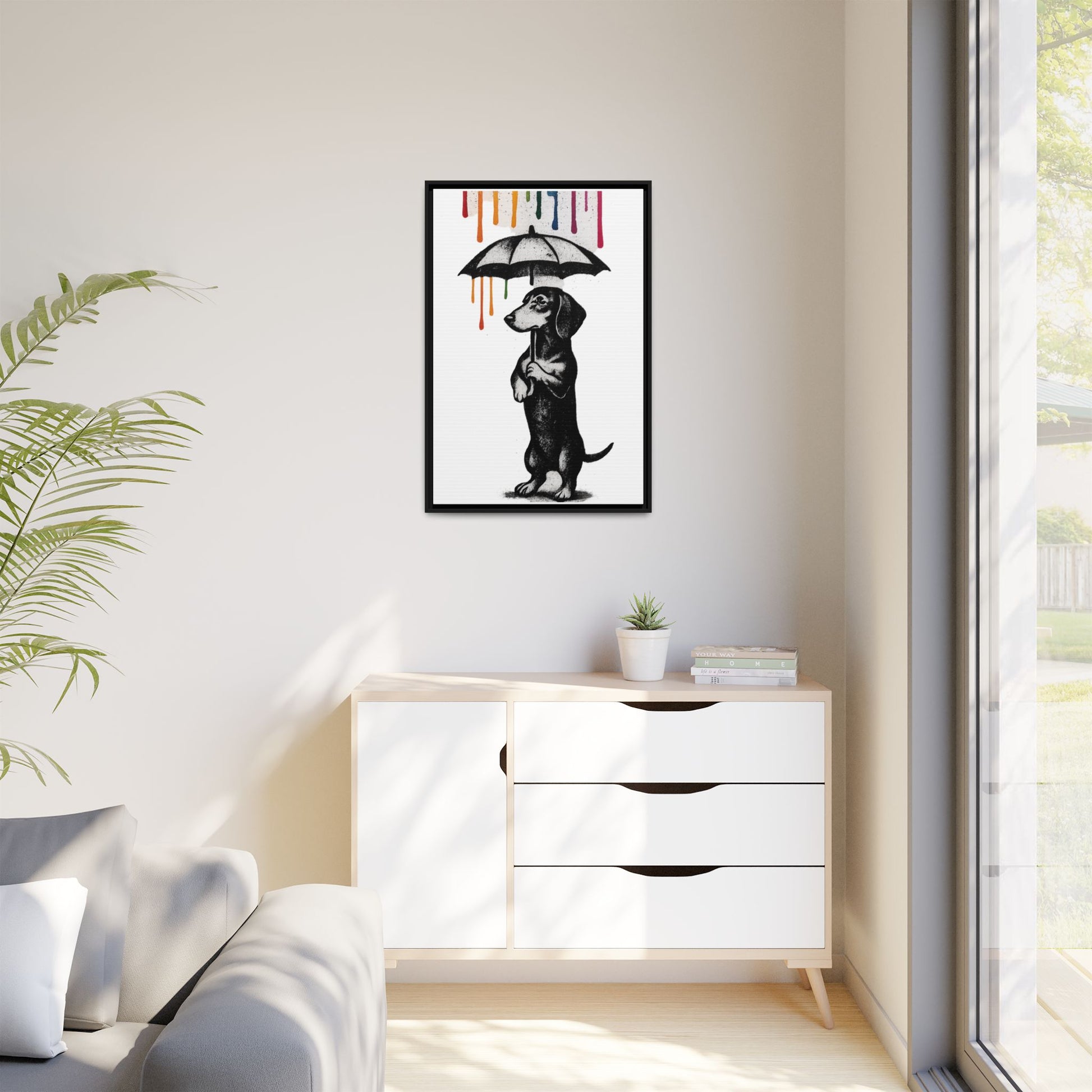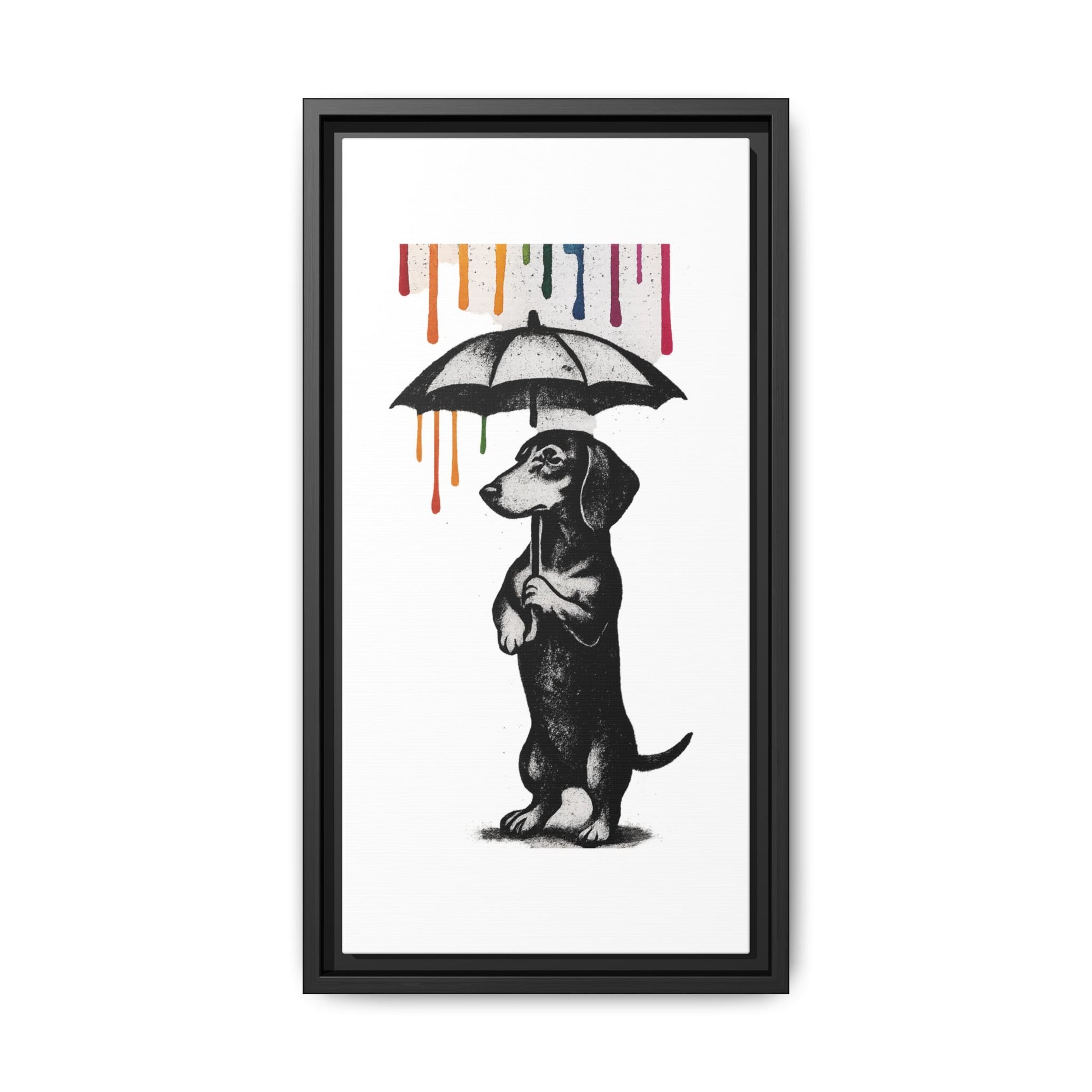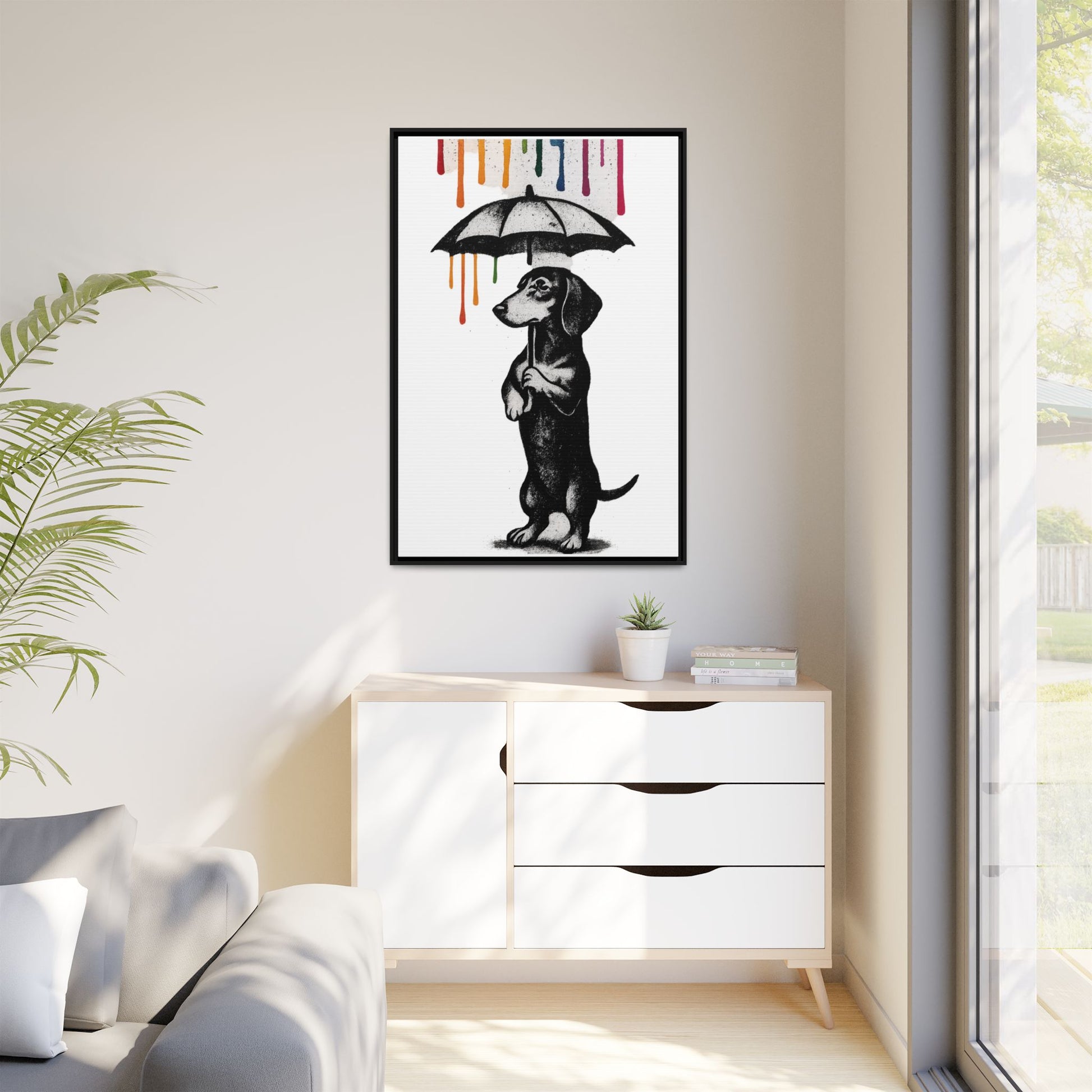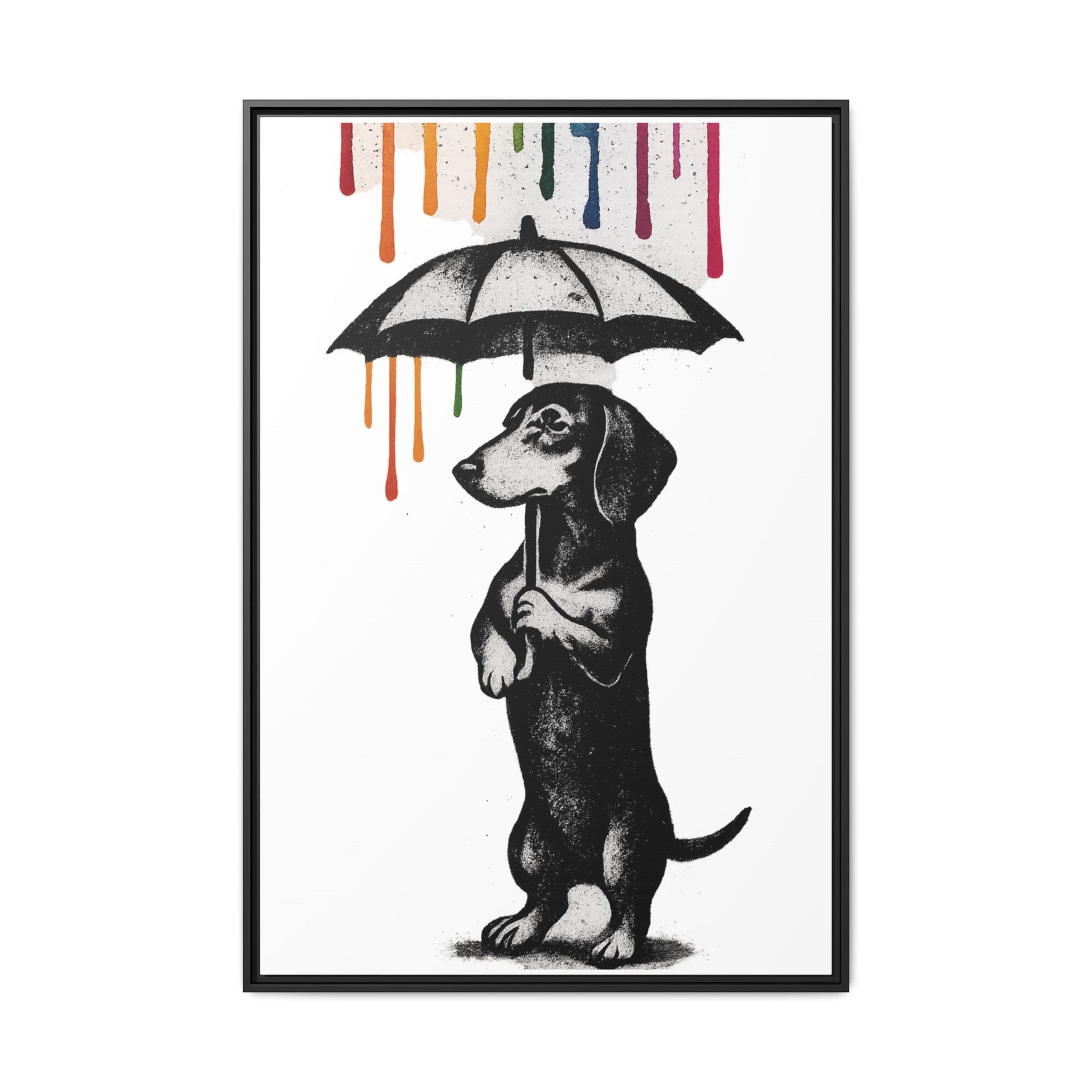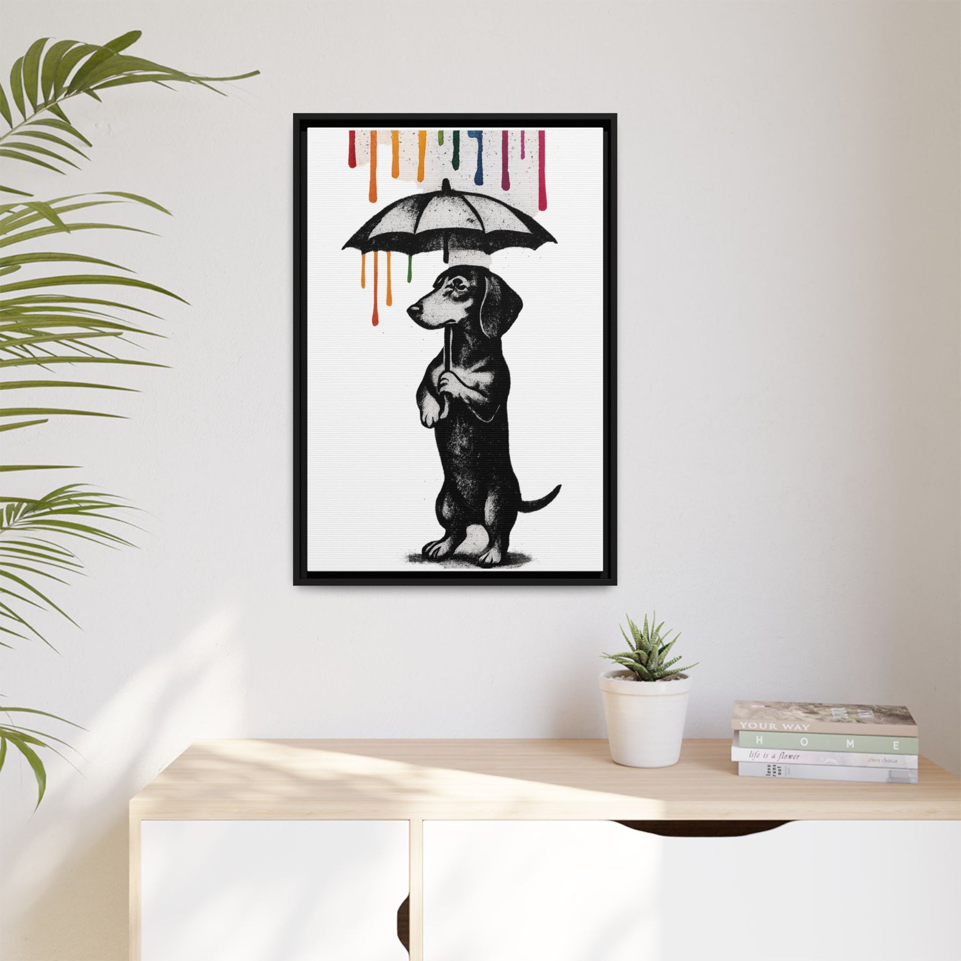 Dackel im Farbenregen – Street-Art Canvas mit Regenschirm & Farbtropfen