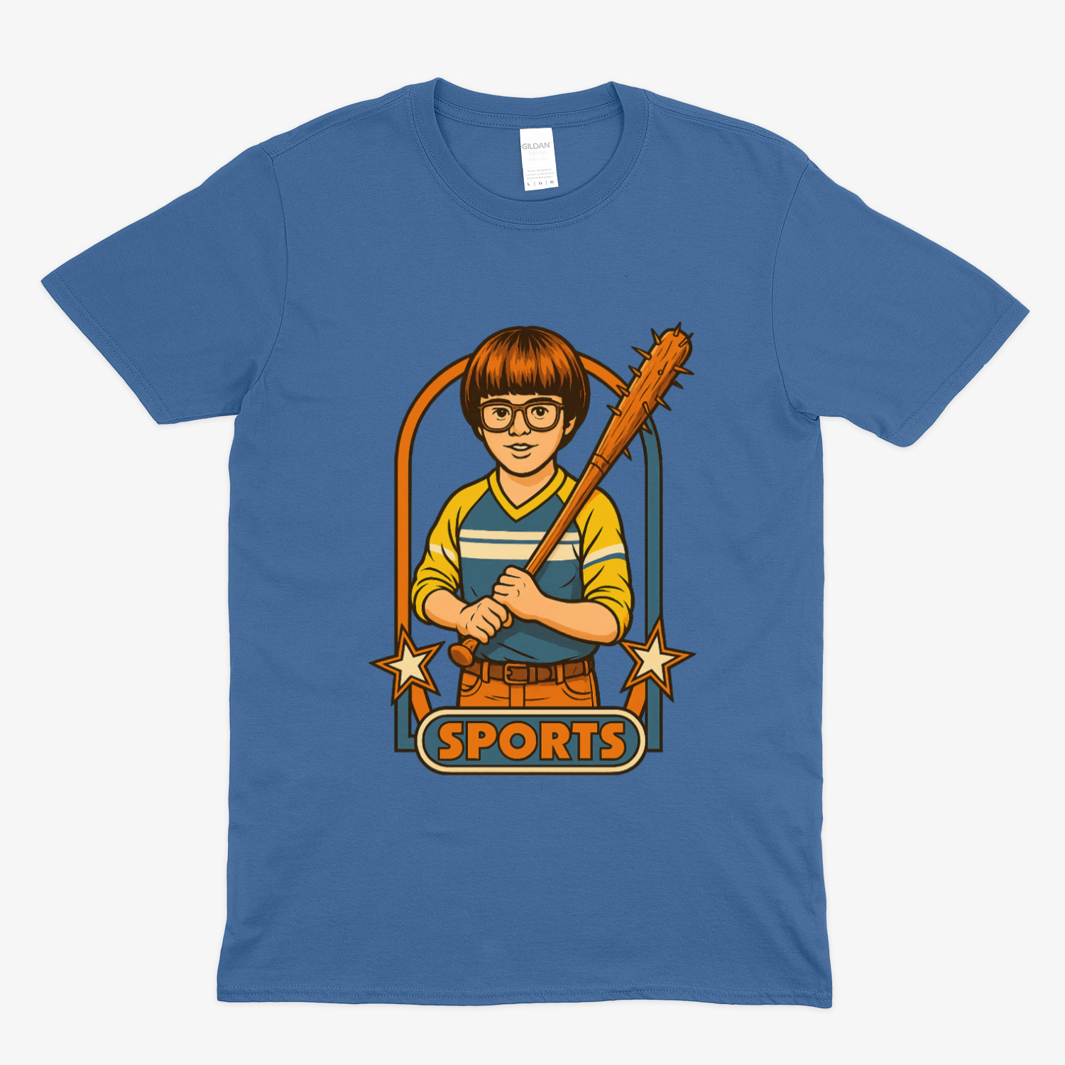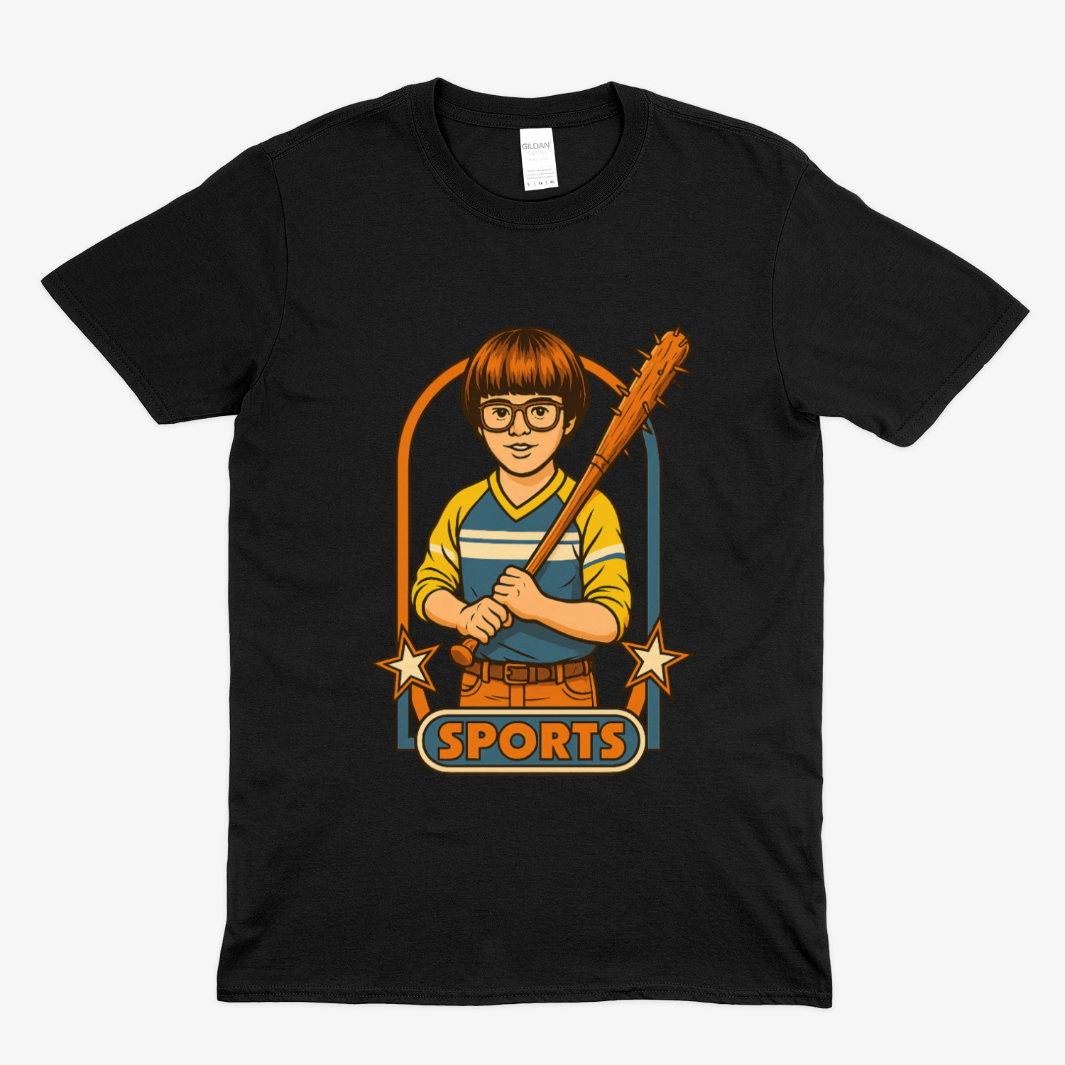 Dieses T-Shirt spielt ein doppeltes Spiel. Auf den ersten Blick: ein sportliches Retro-Motiv, irgendwo zwischen Jugendverein, Sammelkarte und 80er-Jahre-Fernsehprogramm.